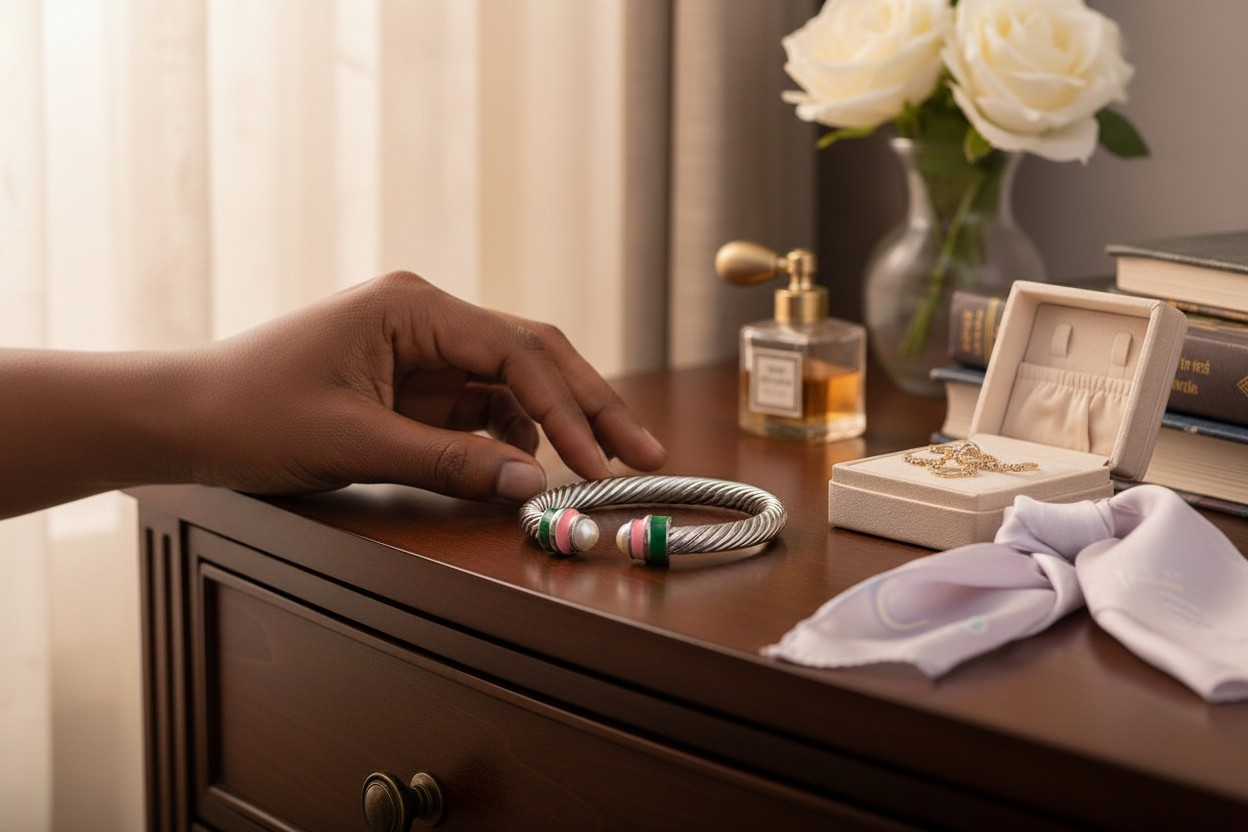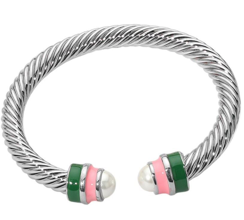 Add a pop of color to your accessories with this twisted cable cuff bracelet, featuring a polished silver‑tone design highlighted by green and pink enamel accents and pearl‑inspired ends. Its open cuff silhouette ensures effortless wear and a chic, contemporary feel. • Lead and nickel compliant