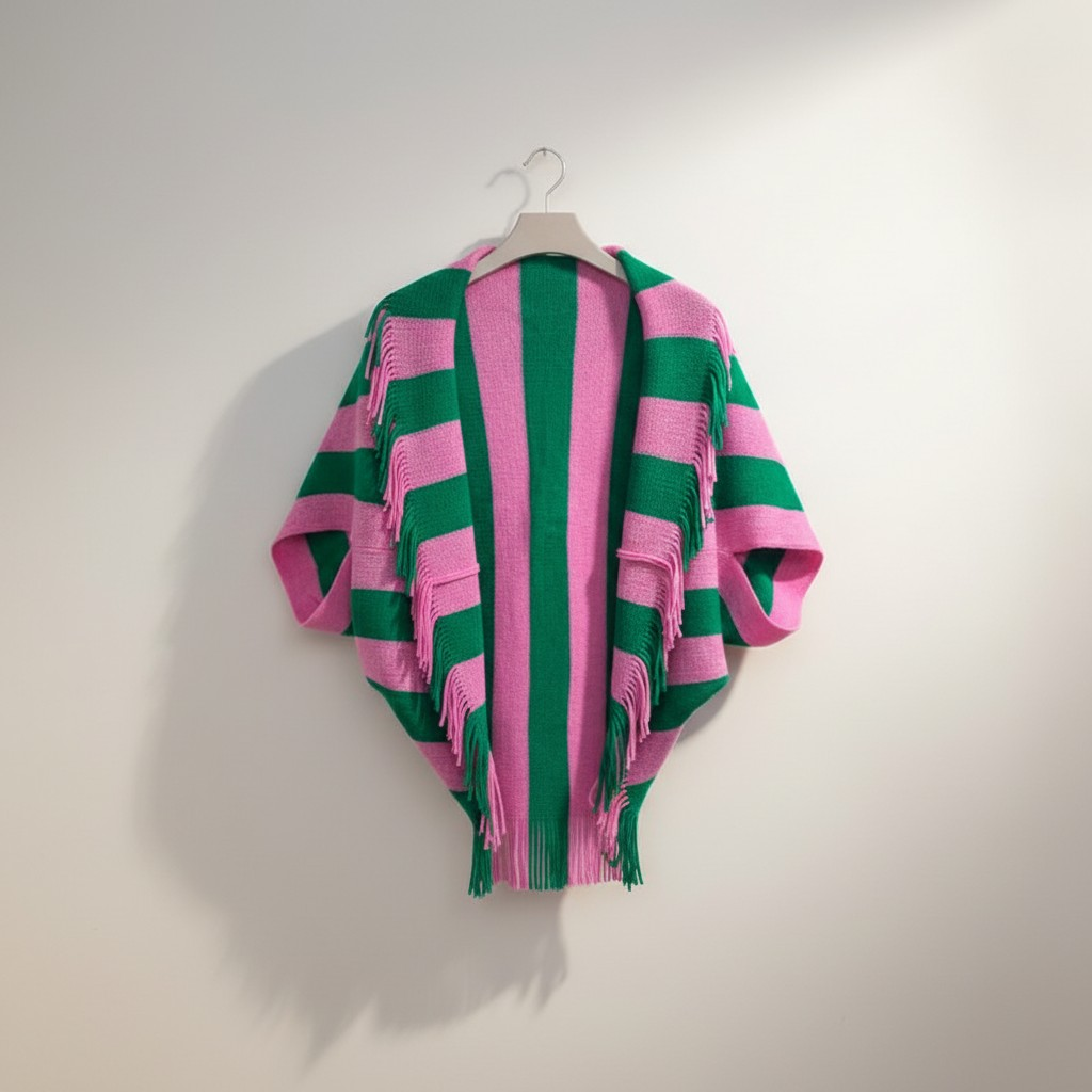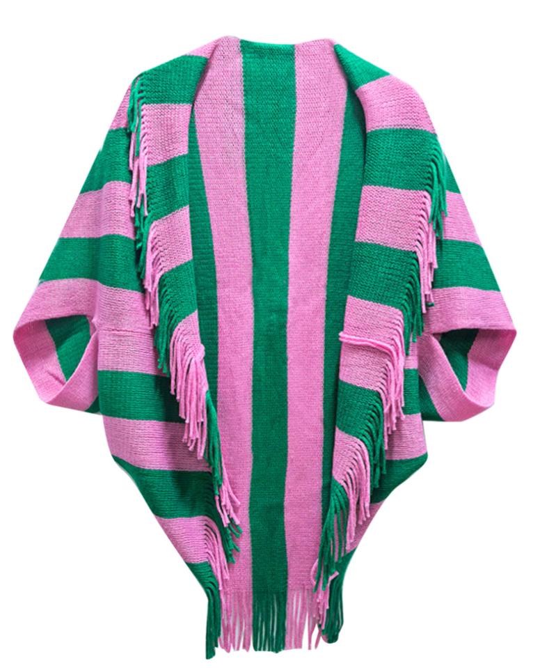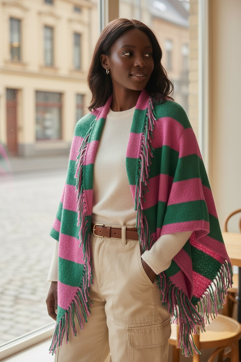 This super cute striped open‑front shawl wrap features a soft feel and fun fringe detailing. Designed for easy layering, it brings warmth, texture, and a touch of elegance to any outfit. A versatile piece that carries you comfortably through changing seasons.